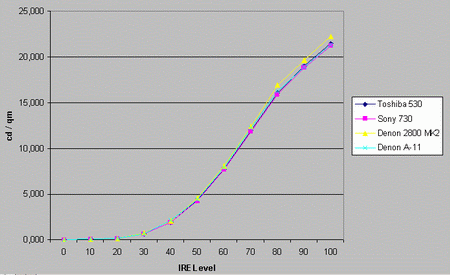 Ebenfalls schwierig sieht es bei der Helligkeitsverteilung aus: Sie lässt sich erst mit Messinstrumenten akkurat überprüfen. Gemessen wird die Gammaverteilung in einer sogenannten Gammakurve. Sie setzt die verschiedenen Helligkeitspegel in Beziehung zur tatsächlich ausgegebenen Bildhelligkeit. Die "Einheit" der Helligkeitspegel sind die sogenannten "IRE" Level. IRE 0 entspricht schwarz, IRE 100 Weiß, IRE 50 Mittelgrau. Vereinfacht kann man sie als "Prozentangaben" von Weiß verstehen: 0% (Schwarz) bis 100% (Weiß). Beim Test misst man nun die Lichtausbeute unterschiedlicher IRE Level, erzeugt von Grautestbildern, und trägt sie in ein Diagramm ein.