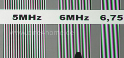 3.9.2 Skalierung Die Skalierungselektronik ist dafür verantwortlich, dass unterschiedliche Auflösungen ineinander umgerechnet werden können. Das Testbild beweist es: Der HC5500 weist selbst im Auflösungsbereich um 6MHz kaum Interferenzen in der Skalierung auf. Alle Linien sind klar erkennbar und voneinander abgegrenzt. Durch diese Eigenschaft wird die Schärfe des Bildes gefördert: Kleine Details stechen klarer heraus, ohne dabei künstlich nachgeschärft zu wirken. Die Skalierung überzeugt sowohl horizontal als auch vertikal.