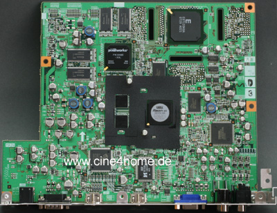 Bei abgenommenem Deckel ergibt sich zudem ein Ausblick auf die Signaleelektronik des HC7000. Wie sein Vorgänger verwendet er den Reon-Chipsatz mit HQV-Skalierung. Dementsprechend identisch ist das Platinenlayout.