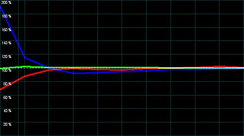 Misst man diesen Modus nach herkömmlicher Methode, so erzielt er einen Anstieg von 2,14 , also etwas zu flach und aufgehellt im projizierten Bild. Doch diese Messung ist nur bedingt aussagekräftig: Bei Gamma "Auto" wird die Helligkeitsverteilung nämlich in Echtzeit immer auf den jeweiligen Bildinhalt angepasst. Somit wird der Kontrast des Projektors besser ausgenutzt und die Arbeitsweise der adaptiven Blende aktiver unterstützt. In der Praxis liefert dieser Modus ein sehr akkurates Bild, ohne überstrahlt zu wirken, und liefert dennoch stets eine sehr gute Plastizität. Der Auto-Modus ist daher auch für die Filmwiedergabe empfehlenswert.