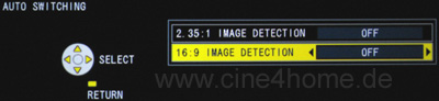Im "Auto Switching" Menü kann der Anwender separat eine "Image Detection" diverser Formate aktivieren. Sie bewirkt, dass der Projektor automatisch die Bildformate anhand der schwarzen Balken ermittelt und wie von Geisterhand die Projektionsoptik entsprechend auf die Leinwand anpasst. In der Praxis bewährt sich diese Erkennung als sehr zuverlässig und überzeugend. Es ist anzumerken, dass bewusst eine Erkennungs-Verzögerung von mehreren Sekunden eingebaut wurde, um ein störendes Wechseln bei nur kurzzeitigen Formatwechseln zu vermeiden. Erst wenn das Format sich dauerhaft ändert, wird die automatische Anpassung aktiviert. Selbstverständlich ist die automatische Erkennung auch komplett abschaltbar.